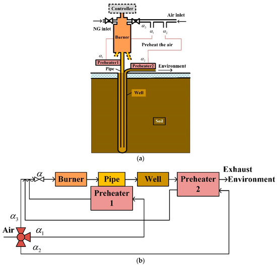 The energy-saving strategy for air-preheating mode is to use the residual heat of the system to –preheat the air entering the burner for combustion. In the basic method (BM), heat from high-temperature parts directly exposed to the environment in the system is wasted and the residual heat can be used up. To solve the problem, preheaters for air-preheating mode are set. As shown in Figure 4, the air to be introduced into the burner is divided into three parts: The first part passes through preheater 1 between the burner and the inlet of heating well, the second part passes through preheater 2 at the outlet pipe of the heating well, and the third part enters the burner directly. Three schemes are designed according to different preheating ratio to different preheaters. The preheating ratio of air through preheater 1 is α1, preheating ratio of air through preheater 2 is α2 and the ratio of air that does not pass through the preheater directly into the burner is α3. The airflow circulation of energy-saving strategy for air-preheating mode in polluted-soil thermal remediation system is different from that in the basis method (BM), as shown in Figure 4b.