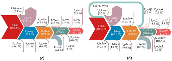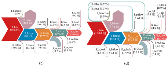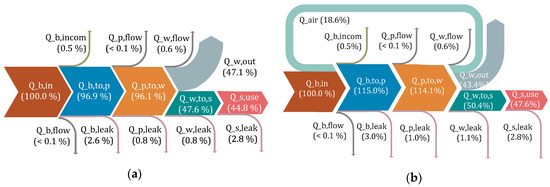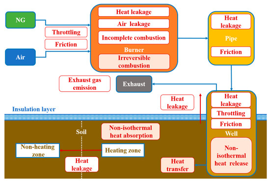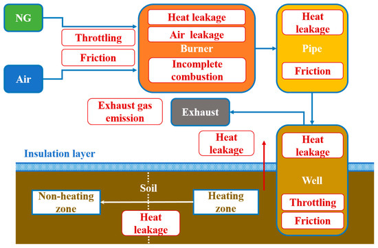 The balance models are based on energy loss and exergy loss of each component in the process of energy flow and exergy flow. Figure 5 shows the energy loss of each component of the polluted-soil thermal remediation system. At the beginning of the energy flow throughout the system, the natural gas (NG) and air carry energy through their respective pipes into the burner. When the gas flows through the pipeline, there are throttling and friction process in the flow, which cause an energy loss. Throttling is a local flow loss, while friction is a path loss of flow. In reality, as long as there is flow in the pipeline, there will be flow loss, and as long as there is a pipe with fluid exposed to the environment, there will be heat leakage loss.