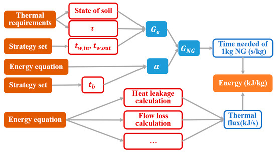 As Figure 7 shows, the calculation process of parameters of energy analysis starts at the thermal requirements and ends at the energy. The calculations of excess air coefficient and mass flow rates and are given in Appendix B (a). These three parameters are used to solve the time needed of flowing 1 km natural gas (NG). The thermal flux has been modeled in Section 3.2. The calculation process of parameters of exergy analysis is similar to that of energy analysis.