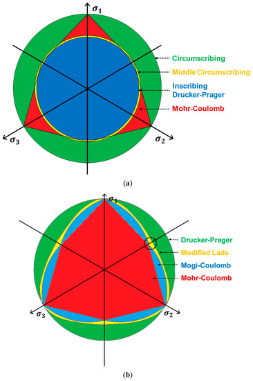 (a) Failure surfaces in -plane calculated by the Drucker–Prager and Mohr–Coulomb failure criteria. The Drucker–Prager constants were determined with the assumptions that the failure surface circumscribes (green), middle circumscribes (yellow) or inscribes (blue) the failure surface of the Mohr–Coulomb (red) criterion. Internal friction angle is 30°. (b) Failure surfaces in -plane calculated by the Drucker–Prager (circumscribing case, green), modified Lade (yellow), Mogi–Coulomb (blue), and Mohr–Coulomb (red) failure criteria. The dashed black circle represents the stress state where the maximum and intermediate principal stresses are identical. Internal friction angle is 30°.