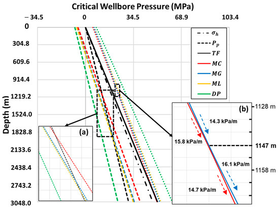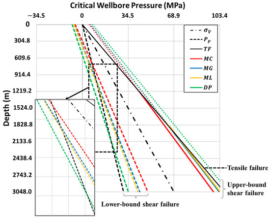 The values at lower-bound shear failure are larger in magnitude at shallow depths and decreases with depth (Figure 8a). In addition, the Mohr–Coulomb and Drucker–Prager criteria yield the narrowest and the widest safe drilling windows. On the other hand, the value at tensile failure (black solid) remains constant for the entire depth. This is because the values at tensile failure with the zero tensile strength solely depends on the in-situ stress and pore pressure (see Equations (1)). And since its gradients are assumed as constant for the entire depth, so are the values.