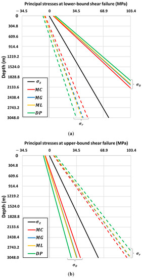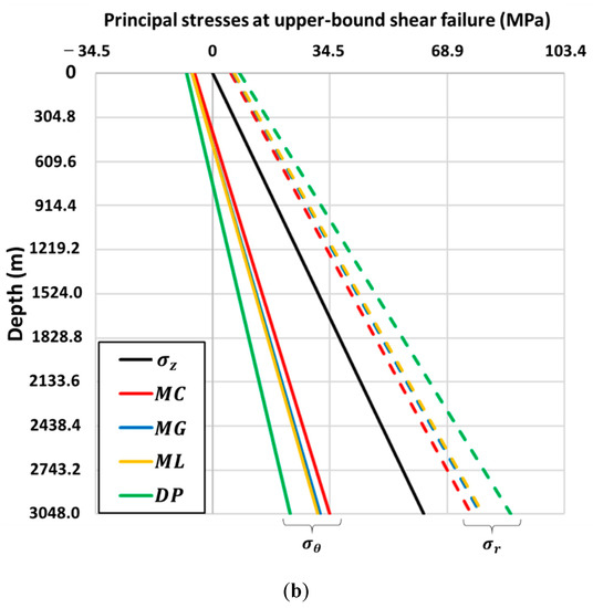 Figure 5a,b show the radial, axial and tangential stresses at the lower-bound and upper-bound shear failure locations. Like the reverse faulting case (Figure 3), the tangential and radial stresses are the maximum and minimum principal stresses at the locations of lower-bound shear failure (Figure 4). The vertical stress is the intermediate principal stress, and the order of the principal stresses retain the same orientation with respect to the wellbore and are consistent with a compressional tectonic regime over the entire interval at both the upper and lower-bound failure locations.