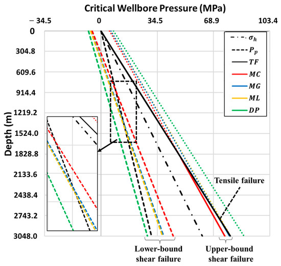 Figure 6 shows the critical wellbore pressure at shear and tensile failures for the extensional basin case. In accordance with the calculated safe windows of the other two cases of Andersonian tectonics (Figure 2 and Figure 4), the safe drilling windows calculated by the Drucker–Prager and Mohr–Coulomb criteria again have the widest and narrowest widths (Figure 6), respectively. The result from the Mohr–Coulomb criterion shows that the upper-bound shear failure is expected for the wellbore pressure exceeding the critical pressure at depth greater than 2905 m. For the other shear failure criteria, tensile failure will be more likely to occur than shear failure for the entire 3048 m deep well. As the dashed lines in Figure 6 indicate, the critical wellbore pressure at the lower-bound of the safe window is lower than the pore pressure at specific depths. According to the Mohr–Coulomb, Mogi–Coulomb and modified Lade criteria, the shear failure can occur even when the wellbore is maintained over-balanced at a depth greater than 1188, 1864, or 2002 m (magnified frame (a) in Figure 6). However, the result from the Drucker–Prager criterion shows that shear failure can be prevented at all depths up to 3048 m deep, even when the wellbore fluid pressure is lower (underbalanced) than the pore pressure. Compared to the other Andersonian cases (Figure 2 and Figure 4), the interval that requires higher wellbore pressure than the pore pressure is located at deeper formations for the extensional basin (Table 4). Our conclusion is that the normal faulting case is the Andersonian case with the deepest intervals requiring overbalanced drilling to support wellbore stability.