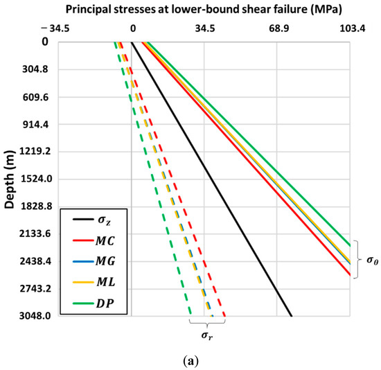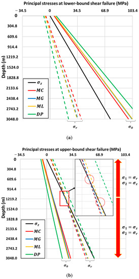 In order to further unearth the cause of the abrupt change in the shear failure gradient, the locally induced stresses at the failure points were analyzed (Figure 7a,b). As for the other Andersonian cases (Figure 3 and Figure 5), the tangential, axial and radial stresses are the maximum, intermediate and minimum principal stresses. The principal stress order at the lower-bound shear failure envelope ( or ) remains consistent for the entire drilling interval (Figure 7a). However, the principal stress condition at the upper-bound shear failure location, or (magnified in Figure 7b) shows that the axial stress becomes the intermediate principal stress at shallow depth (instead of the radial stress). Consequently, the order of the principal stresses at the upper-bound shear failure location reverses from to at exactly the depth where the shear failure gradient changes slope. The principal stress order reversals occur at depths of 1147 (Mohr–Coulomb), 1147 (Mogi–Coulomb), and 1367 m (modified Lade), see red circles in the magnified frame of Figure 7b.