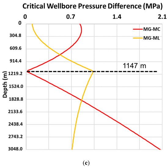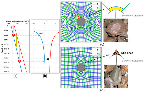 Since the Mohr–Coulomb and Mogi–Coulomb criteria take into account the order of the principal stresses in critical wellbore pressure calculation, the gradients show a sudden alteration at the depths where the principal stress order reverses. However, such a reversal does not have an influence on the critical wellbore pressure gradient calculated by the modified Lade criterion as the criterion does not take into account the order of the principal stresses. The difference between the critical wellbore pressures at the upper-bound calculated from the Mogi–Coulomb and modified Lade criteria is maximum at 1147 m depth (yellow curve in Figure 7c). As described in Section 2.2, the stress states at failure of the Mogi–Coulomb and modified Lade are slightly different, except when the two larger principal stresses have the same magnitudes (dashed circle in Figure 1b). In addition, the upper critical wellbore pressure determined by the Mohr–Coulomb and Mogi–Coulomb criteria are identical as the magnitudes of the intermediate principal stress are equal to the maximum principal stress (red curve in Figure 7c), where the effect of the intermediate principal stress is negligible ().