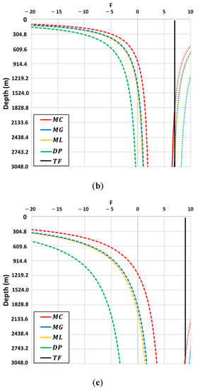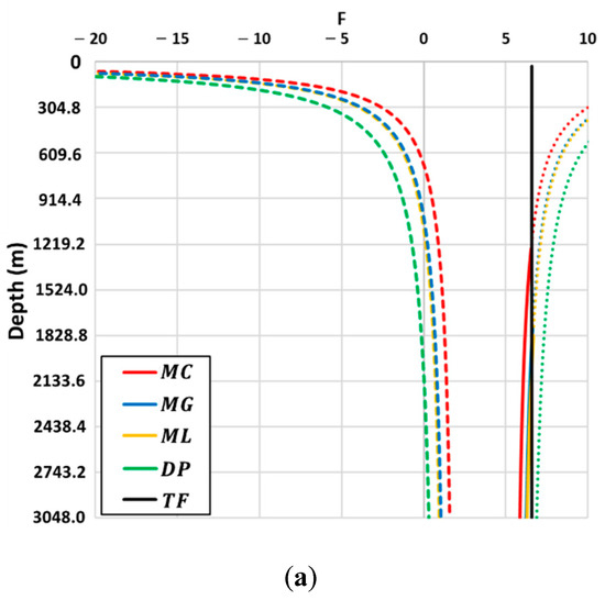 Frac number ( versus depth at failure. values at lower-bound (colored dashed) and upper-bound shear failure (colored solid) calculated by the Mohr–Coulomb (MC; red), Mogi–Coulomb (MG; blue), modified Lade (ML; yellow), and Drucker–Prager (DP; green) criteria, for the following cases: (a) Reverse faulting ( (b) strike-slip ( and (c) normal faulting ( F values at tensile failure (TF; assuming zero tensile strength) are depicted with the black solid line.