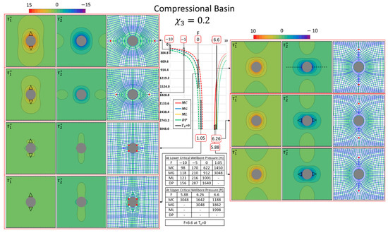 At all times, the value (1, 2, or 3) of subscript should be identical to the one used for normalization of used in Equation (A1b), because each pair of values solves the Kirsch equations for the radial and tangential stresses (, which can be translated to dimensional stress multiplying each value by (duly observing for any undue sign switches; see details in Appendix A of [1]). The subscripts in Equation (A1d) will differ for the compressional, strike-slip and extensional basins, with indicating the direction of the wellbore, and and are the appropriate complementary principal stress axes in the plane of study. For example, a vertical wellbore in compressional, strike-slip and extensional basins, will have the indices () as follows: (3,1,2), (2,1,3) and (1,2,3), respectively. When the wellbore is horizontal, the indices switch accordingly. For plane stress, and for uniaxial stress, with expressing both end members and any intermediate state of far-field deviatoric stress. The merit of using the non-dimensional scaling parameters is that each pair of values corresponds to a unique stress trajectory pattern as has been mapped out in detail elsewhere [1,26].