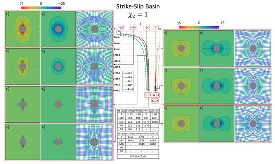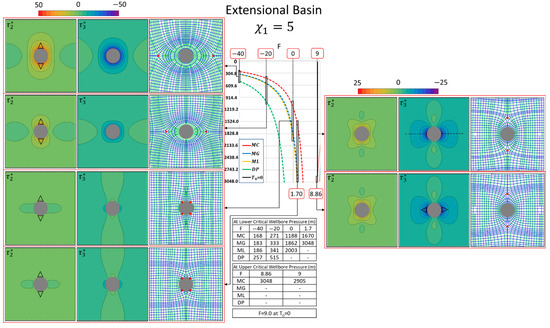Figure 8c shows the values at shear failure and tensile failure for the normal faulting case. The values have a larger range in magnitude at shallow depth, which decreases downward with depth. Due to the low gradient of the intermediate deviatoric stress (0.7 kPa/m), the values occupy a broad range at the margins of the safe drilling window for the normal faulting case (Figure 11). In contrast, the window of the critical wellbore pressure in the traditional presentation (Figure 6) is the narrowest of all the Andersonian cases. However, we emphasize that the traditional method of representing the safe drilling window graphs the wellbore pressure at failure (Section 3), whereas our complementary method graphs the scalar, which is the normalized net pressure on the wellbore. The combination of ( values then shows the unique stress trajectory patterns and stress magnitude contour plots in the plane of study normal to the wellbore, which we suggest provides valuable additional insight on wellbore stability and the failure paths in case the safe drilling window is overstepped. In accordance with the wellbore pressure values at failure (Figure 6), the Mohr–Coulomb criterion yields the most conservative results (Figure 11). Meanwhile, the values from the Drucker–Prager criterion show the widest safe window and a larger range of values.