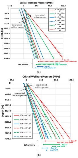 In Section 3 and Section 4, a systematic wellbore stability analysis was performed using input parameters selected from the gathered field data (Section 2.1 and Section 2.2). Since the present study covers a wide range of depths, the initial analysis assumed constant strengths at each depth. In any particular drilling location, the rock strengths may vary with depth, lithology, discontinuities, etc. Here we expand our analysis with critical wellbore pressures by considering a certain variation in the rock strength, related to such factors as the cohesion and internal friction angle. For the cohesion, a higher value of 13.8 MPa was selected (instead of 6.9 MPa used in the main analysis, Section 2.1) as there are field cases with the cohesion value of 12.4 and 19.8 MPa (Table 1). In addition, the internal friction angle can be very low for shale formation (as low as 15°), where many wellbore instability problems occur [28]. Therefore, the internal friction angle of 15° (instead of 40° used in the main analysis, Section 2.1) was evaluated for a comparison of the critical wellbore pressure. In this section, only the Mogi–Coulomb failure criterion was evaluated, as it yields critical values that are intermediate in the range between the conservative Mohr–Coulomb and the more liberal Drucker–Prager criteria.