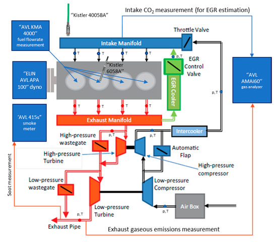 A simplified scheme of the engine is shown in Figure 1. It is homologated for Euro 5 regulations and equipped with a high-pressure CR fuel injection system, a twin-stage turbocharger regulated by means of valve actuators and wastegate valves and a short-route high-pressure EGR system endowed with an EGR cooler. The EGR valve is installed downstream of the EGR cooler.