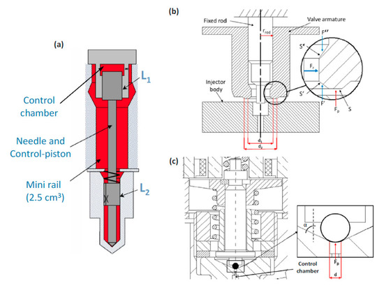 Figure 2 shows a schematic of the indirect-acting piezo-driven injector, endowed with the bypass-circuit [23], while Figure 3 and Figure 4 represent the direct-acting piezo injector [12] and the solenoid-driven one, respectively; the latter highlights the pressure-balanced pilot-valve [22] and a standard pilot-valve.