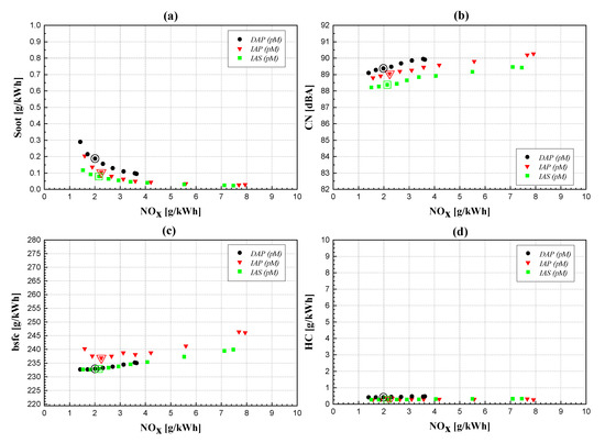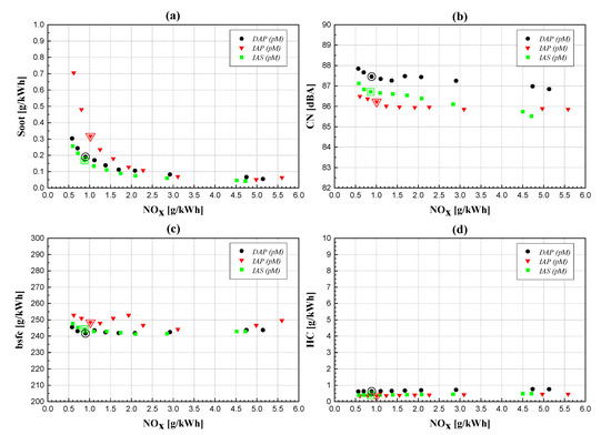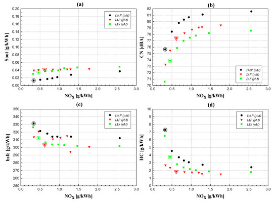 The engine-out soot and NOx emissions at 2000 × 5 (Figure 8a) show a clear trade-off behavior, which is typical of a conventional diesel combustion mode, for each of the three examined injector typologies. Nevertheless, a low-NOx combustion can also be achieved for these higher load and speed conditions, through the application of a relatively delayed fuel injection pattern and a high EGR rate (cf. the contoured symbols in Figure 8, which represent the results pertaining to the reference calibration for each injector type). The worst soot-NOx trade-off can be observed for the IAP injector (cf. triangle symbols in Figure 8a), which features more than doubled soot emissions compared to the other two injector solutions for the highest EGR rates (lowest NOx values). This is because, as already mentioned, the IAP injector gives the worst atomization and the lowest premixed degree, thus entraining the least air inside the injected fuel plumes and locally creating the richest mixture portions, which are prone to forming soot particles.