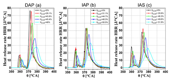 Comparison of the HRR traces featuring different EGR rates, at 1500 × 2, for the three injector typologies under investigation: (a) DAP; (b) IAP; (c) IAS.