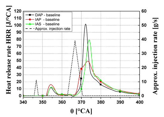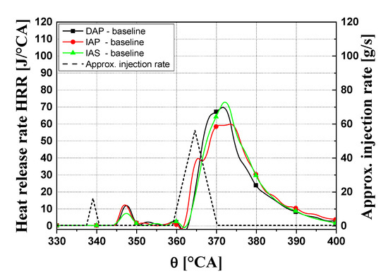 The CN vs. NOx trends (cf. Figure 8b) at 2000 × 5 show a slight trade-off behavior, i.e., a slight increase in CN when NOx emissions are reduced as a result of higher EGR rates, unlike what is highlighted at 1500 × 2. In this case, the larger premixed combustion phase prevails over the reduction in combustion velocity due to increased EGR and the damping effect resulting from the delayed combustion that develops along the expansion stroke. This leads to higher HRR peaks, higher cylinder pressure derivatives and increased CN as the EGR fractions grow. The lowest CN level of three injector types is achieved by the IAP injector, with improvement of up to 1–1.5 dBA with respect to the other solutions. The three HRR traces pertaining to the baseline tests, for each injector, are plotted in Figure 9 versus the crankshaft angle. It is clear that the IAP injector determines the lower ignition delay and, thus, less fuel to burn in the premixed stage, and this gives rise to the lowest HRR development and consequently to the lowest CN.