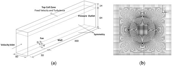 The computational domain is constructed according to the Architectural Institute of Japan (AIJ) guidelines [], as illustrated in Figure 1a with its main boundary conditions, and this domain is used for all the test cases. Moreover, the corresponding computational settings are summarized in Table 1. For the ground layer, the grids are refined to gain y+ values between 30 and 300 (it is in the accepted range for the wall function approach used in the computations), getting nearly 50 nodes below hub height for all the test cases. In order to resolve the strong gradients around the turbine rotor, a high concentration of grid points is distributed in the vicinity of the rotor, with the generated mesh shown in Figure 1b. Finally, the total number of grid points used for the computations is around 3.8 million. Similar grid resolutions have been employed in previous studies [,,,] that used the actuator-type models, and they have been proven sufficient to capture the wake characteristics behind a single turbine.