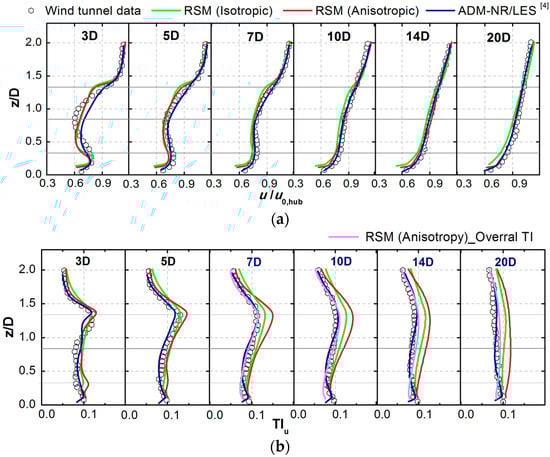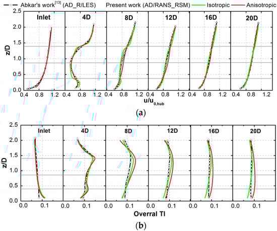 Comparisons of the predicted vertical profiles of the wake velocity and overall TI at chosen downstream locations (x/D = 4, 8, 12, 16, and 20) are shown in Figure 6. From Figure 6a, it is clearly seen that the AD/RANS_RSM method exhibits an almost excellent match with the measured data at all the downstream positions. It can also be depicted that there is no significant difference between the results obtained under isotropic and anisotropic inflow approaches, except at the position of 4D where the isotropic profile under-estimates the wake deficit, relatively to the LES simulations, at the wake center and over-estimates it near the edge of the wake; a slight over-estimation of the wake deficit along the vertical wake affected region can also be observed at the position of 8D.