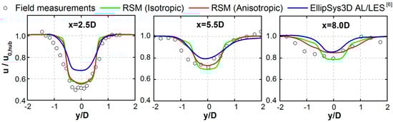 Horizontal distributions of normalized wake velocity at hub height at downstream distances of 2.5D, 5.5D, and 8.0D. Comparison between predictions obtained from the AD/RANS_RSM under isotropic and anisotropic turbulence inflow conditions, and field measurements (experimental data obtained from Cleijne []). Besides, in order to avoid the uncertainty in measurements and assess the performance of the AD/RANS method fairly, numerical results [] obtained from the AL/LES computations using Technical University of Denmark (DTU’s) CFD solver EllipSys3D are also included.