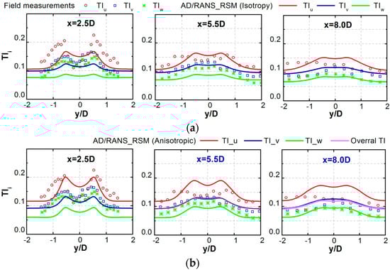 Comparison of turbulence intensity in three flow directions at different downstream distances. (a) Results of the AD/RANS_RSM method under the isotropic inflow condition; (b) results of the AD/RANS_RSM method under the anisotropic inflow condition.