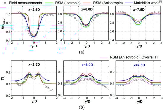 Afterwards, based on the calculated results from the AD/RANS_RSM method under the anisotropic inflow condition, the overall turbulence intensity which is defined in Equation (11) is introduced and included in Figure 2b (illustrated with the magenta color lines).