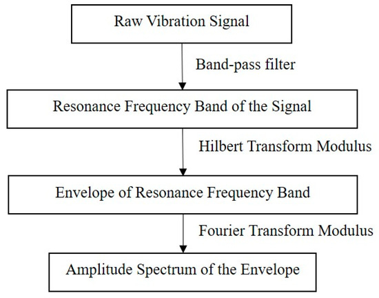 According to Randall [16], in bearing fault analysis, the raw vibration signal spectrum often contains insufficient information for a good diagnosis and, so, envelope analysis must be applied. As shown in Figure 1, in the envelope approach, the signal is filtered in the high frequency range, next to resonance, where the impact pulses are amplified. The resulting signal is amplitude demodulated by the modulus of Hilbert Transform, producing the envelope signal, whose amplitude spectrum is obtained by the modulus of the Fourier transform. The amplitude spectrum of the envelope signal presents the diagnostic information as spectral components at the characteristic frequencies of the bearing elements.