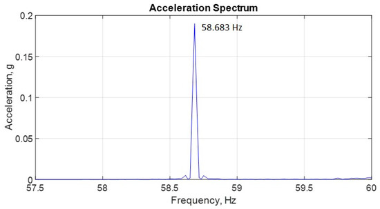 The acceleration spectrum shows a peak at 58.683 Hz (Figure 6), just in the range of the tachometer reading. Of course, the peak frequency is not the real frequency, since it is the center of a discrete frequency bin. The real frequency is in the range of the peak frequency ±Δf/2, where Δf is the spectral resolution. The spectral resolution is the inverse of the acquisition time. As informed in the paper, the acquisition time is 60 s. So, Δf/2 = 0.008 Hz ((1/60)/2). Hence, by the spectrum, the real rotor frequency is in the range of 58.683 Hz ± 0.008 Hz, which is adequate to the proposed analysis.