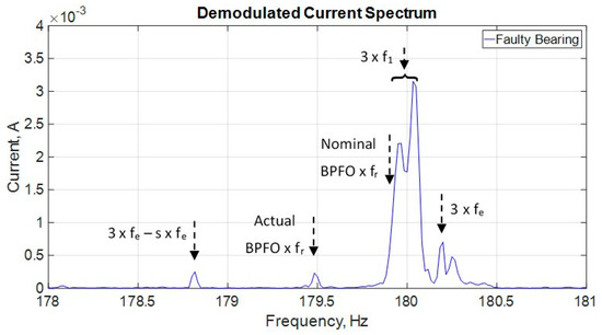 Demodulate current signal spectrum with zoom around the actual BPFO x fr frequency.
