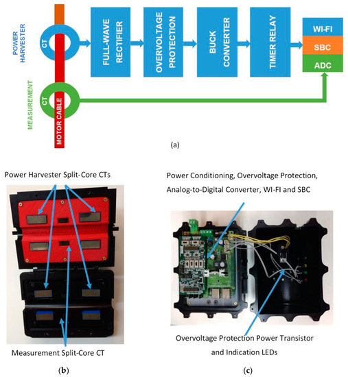Figure 11 presents the concept device developed by the authors. In the block diagram, presented in Figure 11a, the Power Harvester Current Transform (CT) outputs the power in AC form, the Full-Wave Rectifier transforms it to DC form, the Overvoltage Protection clamps the voltage to the limit of the Buck Converter input and the Buck Converter steps down and regulate the voltage to a Timer Relay, that will power the application only after a preset delay to avoid transients. The application is a Single Board Computer with a Wi-Fi module and a 24-bit ADC. The application digitalizes the current measured by the Measurement CT and processes, stores and transmits it to the software application for analysis and log.