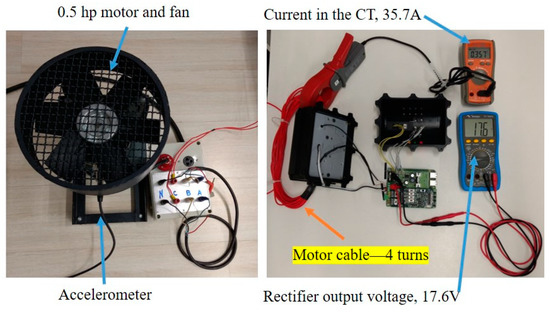 Figure 12 presents the SSWCT installed in a motor cable at Pimental power plant. The second and external CT, mentioned above, can be seen in the picture. Once the installation at Pimental is very recent and interesting results regarding roller bearing faults have not been collected yet, a test setup for the SSWCT is presented in Figure 13. The SSWCT is presented open for test measurements. The supply current of the motor-fan assembly is about 1.5 A in 220V and 60Hz. The SSWCT was designed to operate with a minimum of 35 A. So, to operate the SSWCT with such a small laboratory motor, 24 turns were passed through the CT, producing a magnetomotive force of ~36 A.turn (~1.5 A x 24 turns). Of course, the current measured is divided by 24 in the software to yield the correct value. In the figure, the primary current, 35.7 A, is shown in the orange multi-meter and the rectified voltage, 17.6 Vdc, in the output of the power harvester is presented in the blue multi-meter. The motor current is measured by the internal current transformer of the SSWCT and the accelerometer output is measured by the data acquisition module presented in Figure 2.