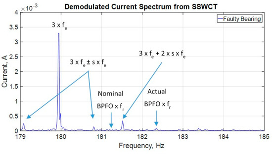 Figure 15 presents the demodulated current spectrum produced using the SSWCT, where a small peak at the same frequency of the dominant peak, shown in the acceleration envelope spectrum, can be seen. This test, and others performed in the laboratory, shows that the SSWCT presents the same functionality of a traditional data acquisition system used for motor current signature analysis. For this run, the rotor frequency, fr, is 59.117 Hz. It is curious to notice that, after many hours running, the actual BPFO for this run is 3.084 (182.333/59.117), against the nominal value 3.066, showing once more the elusive nature of this “constant” and highlighting the importance of the use of acceleration envelope spectrum as a reference for bearing fault studies in the motor current signature analysis.