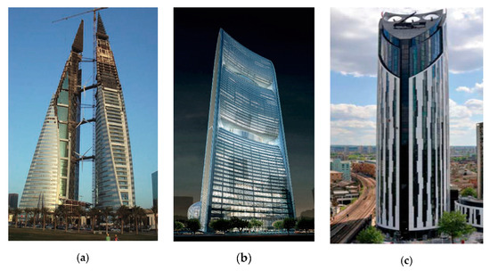 Wind Energy for the Built Environment (WEB) (2001) proposed that large-scale wind power generation systems can be applied to high-rise buildings with an aerodynamic shape [4]. Seven optimal building forms were selected through computational fluid dynamics (CFD) and wind tunnel experiments. The system installed between twin towers provided considerable efficiency compared with other systems. The Bahrain World Trade Center was the first building with large wind turbines. The two buildings support three 29--diameter horizontal-axis wind turbine (HAWT) systems. Smith et al. (2007) informed that the amount of energy using the integrated BIWT systems was almost 1100–1300 per year [5]. This result was 11–15% of the total consumed energy of the building. The Bahrain World Trade Center is shown in Figure 1a. Pearl River Tower was designed to be a zero-energy building [6]. This building has two open spaces between three parts of the building. Eight 5--diameter Darrieus wind turbines are set up in the area of open space. Pearl River Tower is shown in Figure 1b. Strata Tower is a new 43-storey, 148--tall tower designed for sustainable regeneration [7]. This tower has three HAWT systems at the top of the building, and the diameter of their rotors is 9 . Strata Tower is shown in Figure 1c. Although these systems have the advantage of producing large-scale electricity, they have drawbacks such as the need to consider noise, vibration problems, and structural factors due to their large size. In order to install large-scale BIWT systems in high-rise buildings, the structural issues have to be considered in the design process.