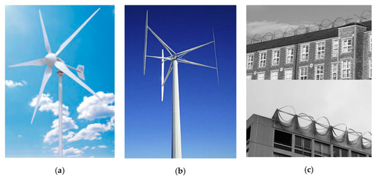Small-scale wind turbine systems: (a) horizontal-axis wind turbine (HAWT) system [8]; (b) vertical-axis wind turbine (VAWT) system, H-type [14]; (c) Crossflex wind turbine system [12].