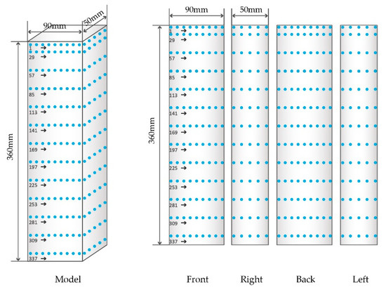The conditions and theories for the experimental setting are described below. The high-rise buildings for the experiment had a longitudinal length, lateral length, and height of 45, 25, and 180 , respectively. The wind environment around the high-rise buildings were analyzed using a miniature model reduced in scale by 1:500; therefore, the size of the reduced high-rise building model was 90 × 50 × 360 mm3 (i.e., longitudinal length × lateral length × height). There were 364 wind pressure-measuring taps in total. There were 117 pressure taps and 65 pressure taps on each side. Figure 3 shows the model size and distribution of the pressure taps.