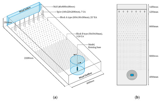 Walls, spires, and blocks were placed in a wind tunnel with a width of 8 , a height of 2.5 , and a length of 23.2 in order to reproduce the 0.25 vertical wind profile exponent. In the case of the blocks for the vertical wind profile exponent, two types of blocks were arranged in the wind tunnel (A type: 100 × 100 × 100 ; B type: 50 × 50 × 50 ). In order to obtain results for various angles of wind attack, a base that can be rotated was installed under the model. Figure 4 gives the schematic of the wind tunnel.