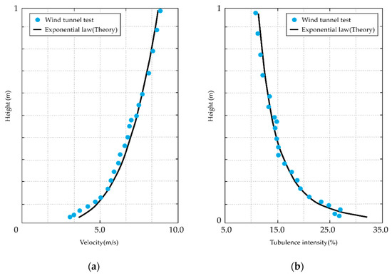 Figure 5 gives the vertical distribution of the wind speed and turbulence intensity obtained from the measured results through an anemometer, and the theoretical results from the exponential law. The wind speed was measured up to a height of 1 m at 22 intervals using the anemometer. The experimental results showed that the conditions of the wind tunnel were appropriate for the main experiment.