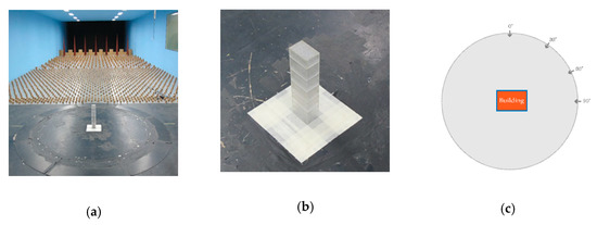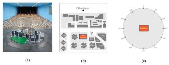Conditions of the experiment (the urban environment): (a) setting of the experiment; (b) schematic of building layout; (c) schematic of the angles of wind attack.