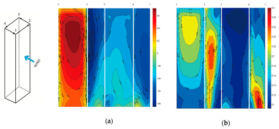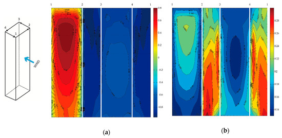 Wind pressure coefficient around the high-rise building without surrounding buildings (0°): (a) mean wind pressure coefficient; (b) fluctuating wind pressure coefficient.