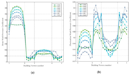 Using the wind tunnel experiments, static and fluctuating wind pressure distributions generated by wind blowing onto the front of the high-rise building in the urban environment were analyzed (0). As mentioned above, the urban area was located in Seoul, Korea. There are various buildings (12–172 high) arranged around the target building. The results are shown in Figure 14 and Figure 15.