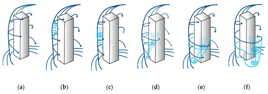 The process of formation and release of vortex shedding around a high-rise building [34]: (a) wind shear layer; (b) formation and movement of a vortex component; (c–f) formation and movement of an inverted conical vortex.