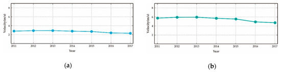 Because of the above facts, the value () of the fluctuating wind pressure around the high-rise building was investigated. The values of the pressure were checked at the positions where the maximum fluctuating wind pressure coefficient (point 347) and minimum fluctuating wind pressure coefficient (point 338) were identified. Since the pressure data were obtained based on the designed wind speed for the experiment (40 ), it was necessary to change the wind speed. The reference wind speed was based on the average wind speed in Seoul, Republic of Korea. For the wind speed data, the annual average wind speed measured from 2011 to 2017 by the Korea Meteorological Administration was used. Because the data were measured from 10 m above the ground, the wind speed was changed by using the exponential power law for the reference speed. The average wind speed measured from 10 m above the ground was 2.67 m/s, and the reference wind speed for checking the pressure values was 5.49 m/s. Average annual wind speed data in Seoul are shown in Figure 11. The points of the maximum and minimum values of the fluctuating wind pressure coefficient are shown in Figure 12a. In the case of the pressure identified at point 338, it was primarily positive, and, in the case of the pressure identified at point 347, it was primarily negative. Time series data of wind pressure of these two points are shown in Figure 12b.