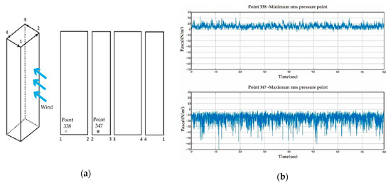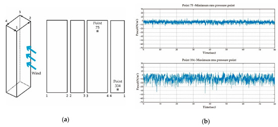 The points with maximum and minimum root-mean-square (RMS) values of fluctuating wind pressure (without surrounding buildings): (a) the locations of the two points; (b) pressure data of each point.
