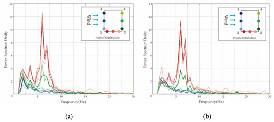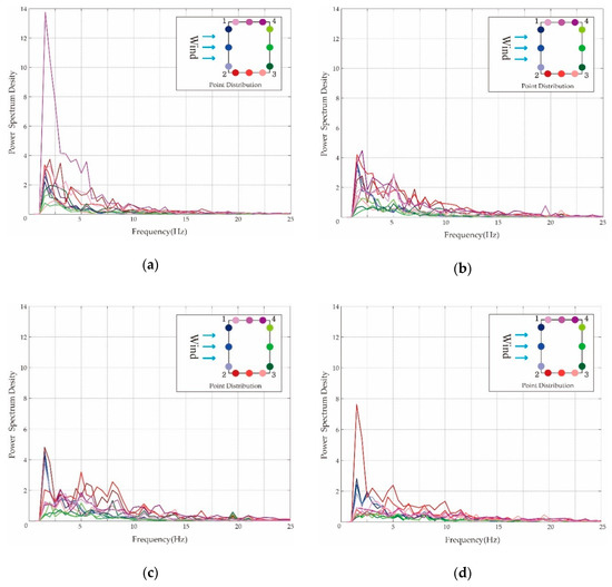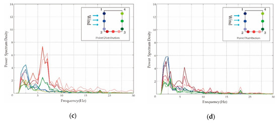Finally, the frequency of fluctuating wind pressure around the high-rise building was analyzed. Generally, the frequency spectrum of fluctuating wind pressure of high-rise buildings is mainly expressed by dimensionless coefficients in wind engineering literature [35]. However, in this study, the frequency spectrum is expressed in hertz to analyze the frequency characteristics of wind pressure for energy-harvesting purposes. The frequency around the high-rise building was analyzed by selecting nine points at the same height. Also, the height was divided into four cases (0.02 H, 0.36 H, 0.62 H, and 0.98 H). The results of the frequency analysis of the nine points for each height are shown in Figure 13.