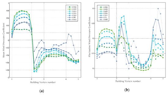Wind pressure coefficient around the high-rise building in the urban environment (0°): (a) mean wind pressure coefficient; (b) fluctuating wind pressure coefficient.