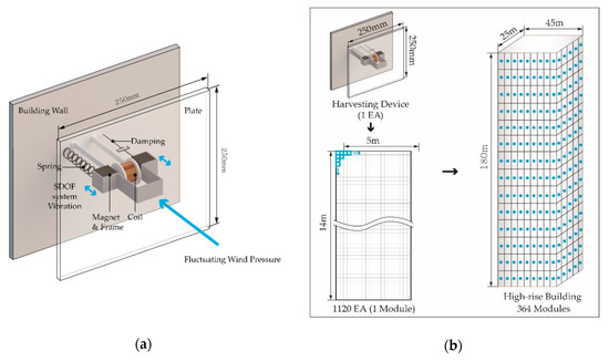 (a) Conceptual diagram of the energy-harvesting system for the analytical model; (b) conceptual diagram of the placement of modules to calculate electricity in the entire building area.