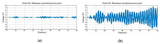 Calculated voltage converted by the energy-harvesting device around the high-rise building without surrounding buildings (angle of wind attack: 0°): (a) minimum calculated power point (point 215); (b) maximum calculated power point (point 347).