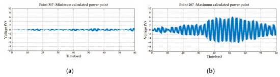 Calculated voltage converted by the energy-harvesting device around the high-rise building in the urban environment (angle of wind attack: 0°): (a) minimum calculated power point (point 357); (b) maximum calculated power point (point 207).