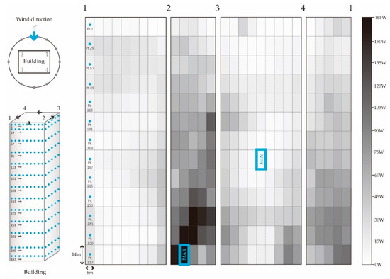 Distribution of the calculated power caused by the fluctuating wind pressure generated around the high-rise building without surrounding buildings (angle of wind attack: 0°).