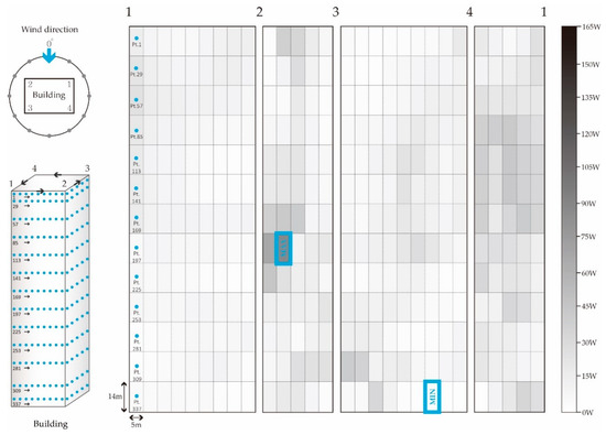 Additionally, applying the above procedure, the total converted power at the angle of wind attack of 0° was calculated when the proposed energy-harvesting device was utilized throughout the entire building area. In order to effectively simulate the power, the area corresponding to each wind pressure tap was defined as one module (14 × 5 ), reflecting the size of the building (45 × 25 × 180 ). Then, the total power of 364 modules was calculated considering the energy-harvesting area of each module. The device could not be installed in the whole area; however, this analysis made sense in terms of checking the maximum available power. The placement of the modules to calculate electricity in the entire building area is shown in Figure 18b. The power per module, calculated from the analytical model of the energy-harvesting device, which uses the excitation force of the fluctuating wind pressure formed by the wind at an angle of attack of 0°, is shown in Figure 21 and Figure 22. Also, the calculated power converted by the energy-harvesting device throughout the entire high-rise building area is shown in Table 8.