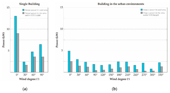 Additionally, the result of output power for wind blowing from various angles using the same analysis model is shown in Figure 23. As a result, higher power was generated around the single building without the influence of surrounding buildings, and the highest energy was generated by wind blowing at the angle of attack of 0°. In addition, to compare the power values obtained from the top and bottom of the high-rise buildings, the power values obtained in the upper and lower areas based on the height of 0.5 H were calculated and compared. As a result of the comparison, in the case of the high-rise building without surrounding buildings, higher energy was obtained from the lower part at a rate of 60.71% of the total when averaging all cases. For buildings located in the urban environment, lower energy could be obtained from the bottom part at a rate of 42.17% of the total. This shows that, when there are additional high-rise buildings around the target high-rise building, the power that can be obtained around the high-rise building becomes smaller. In particular, the amount of power that can be obtained at the lower part of the building becomes smaller. This is due to the fact that the overall wind intensity is weakened, and the generated vortex does not go down to the bottom due to the influence of surrounding buildings.