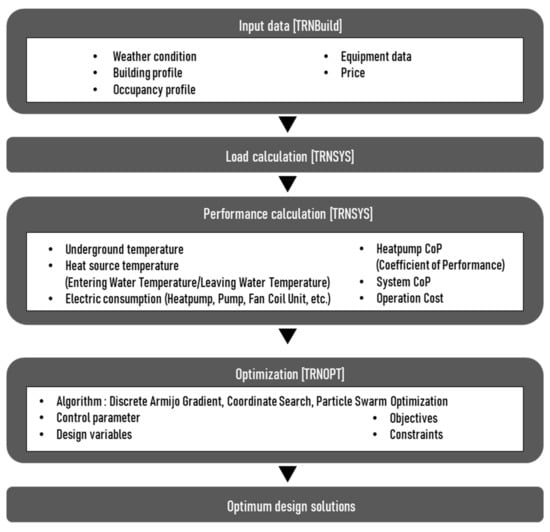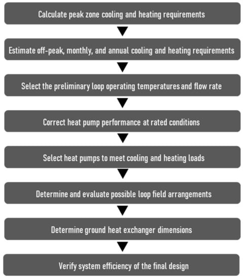 The distribution of GSHP systems, however, has not been actively initiated compared to other energy sources due to their relatively high initial investment cost. Existing design methods for GSHP system are shown in Figure 1 [7]. For the introduction of a GSHP system, boring works must be conducted to install ground heat exchangers, and the borehole depth must exceed 200 m in the case of a vertical closed-loop system [8], which incurs a relatively high initial investment cost. Moreover, the capacity of a GSHP system is generally calculated in response to the maximum load of the building or based on the practical experiences of experts. It is also difficult to reflect load patterns according to the use of the building, the partial-load operation characteristics of the heat pump, and the performance characteristics of ground heat exchangers according to their lengths. Therefore, the initial investment cost may increase due to the excessive design capacity, and it is necessary to improve the efficiency of GSHP systems and to determine the optimal design for their capacity.