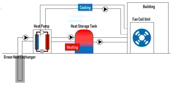 Figure 3 shows the operation method of the applied GSHP system. Direct cooling was performed using geothermal energy as the heat source for the heat pump. During heating, the thermal energy of the heat pump was stored in the heat storage tank, and the energy was sent to the fan coil unit (FCU). When the temperature of the tank dropped below the set temperature, the tank performed heat storage, and the heat pump directly performed heating.